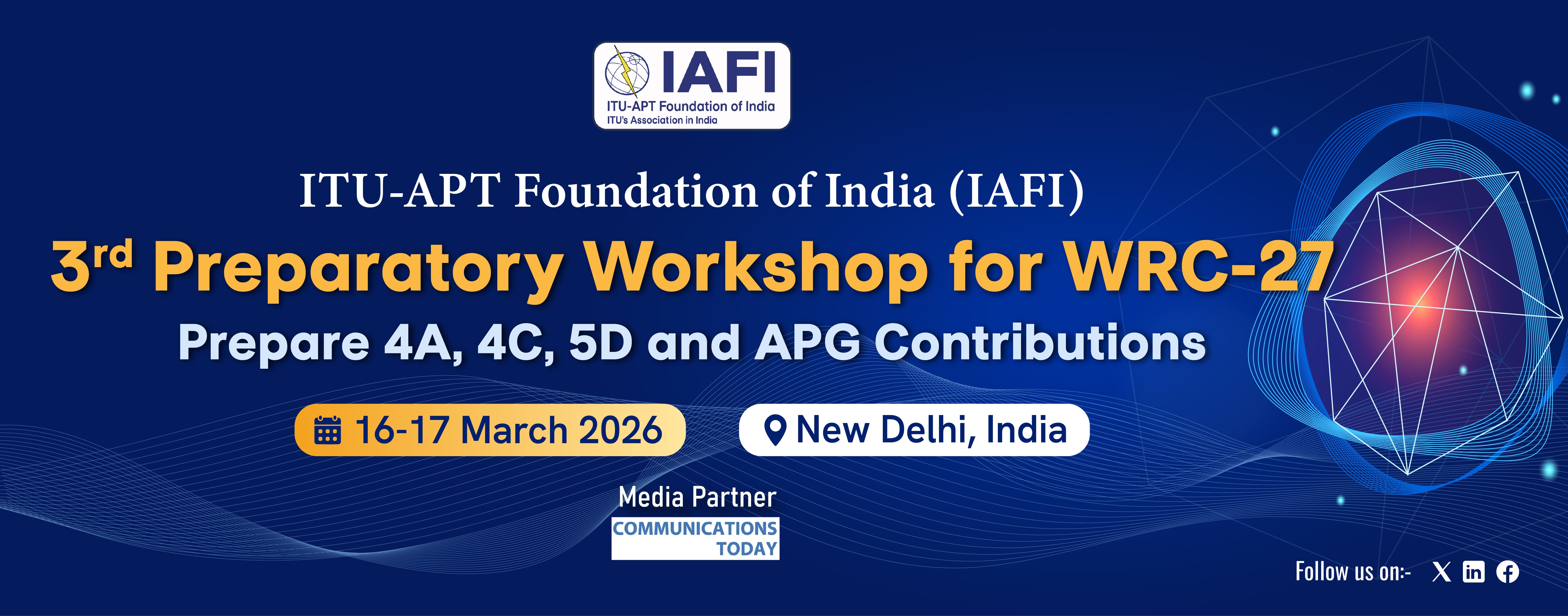 ITU-APT Foundation of India (IAFI) is a non-profit, non-political, non- partisan registered foundation. IAFI is working for last 20 years with the prime objective of encouraging involvement of professionals, corporate, public/private sector industries, R&D organizations, academic institutions, and such other agencies engaged in development of ICT sector, in the activities of the International Telecommunication Union (ITU) and the Asia Pacific Telecommunity (APT). Further details of IAFI are available on our website https://iafi.in
